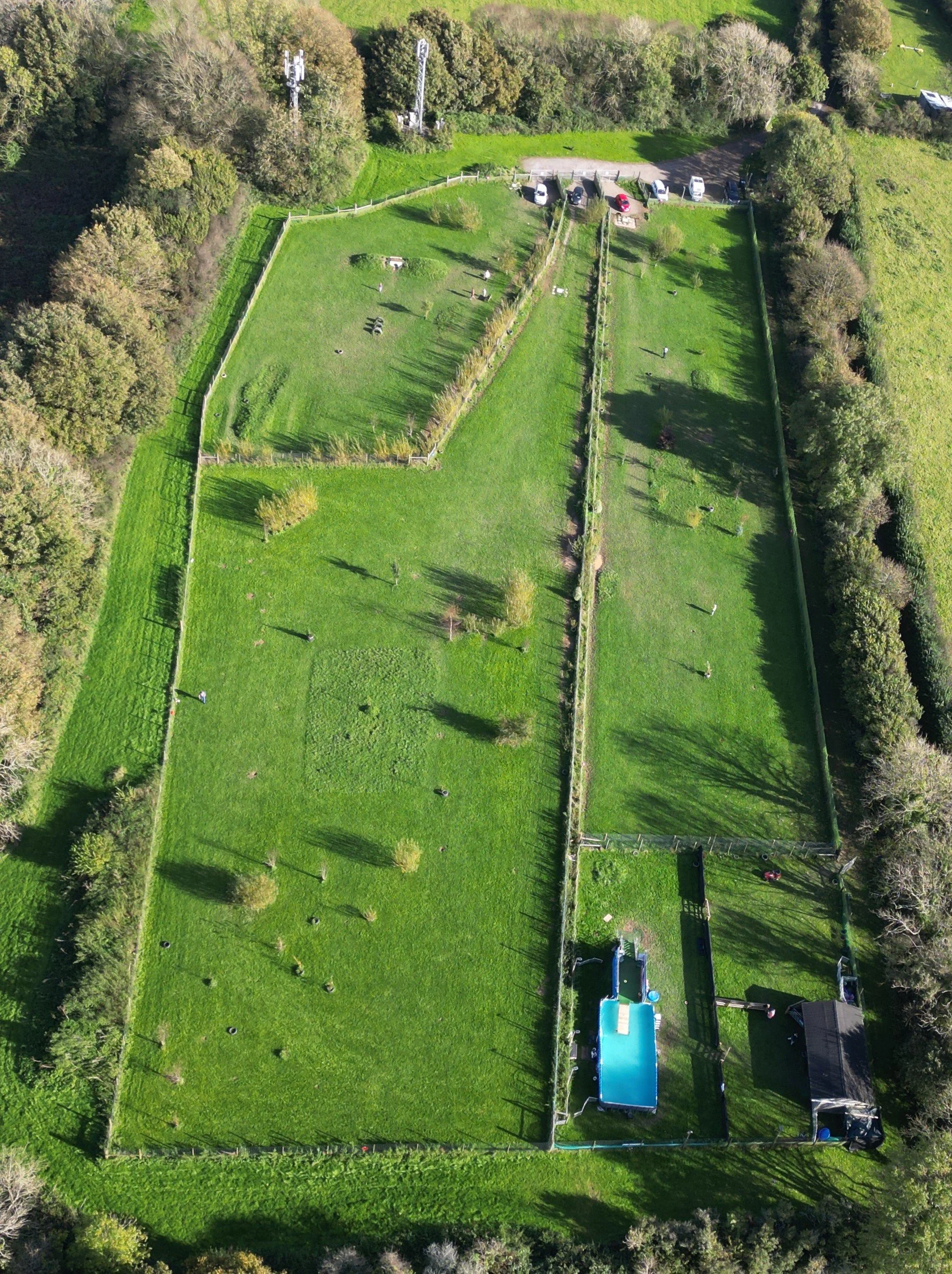 Paws 2: Approximately just over 1 acre, dips off slightly in the bottom right hand corner due to the natural contour of the field. This is the central paddock. This field is not suitable for small breeds such as Terriers and Dachshunds due to the grid sizing of the fence panels.